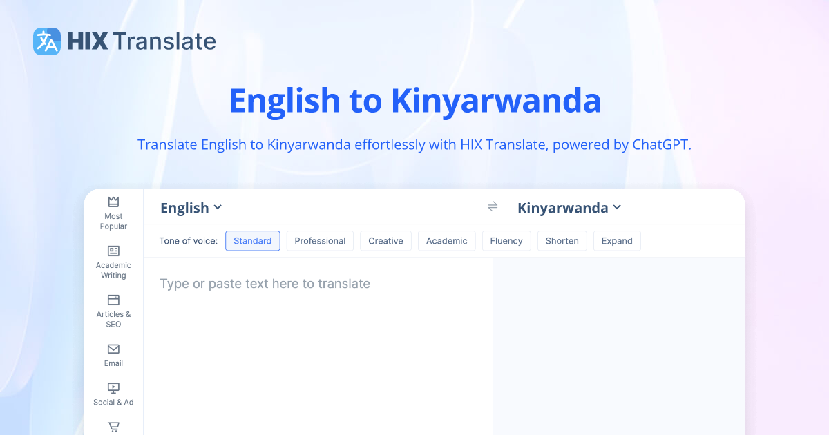 Expereince seamless English to Kinyarwanda translation online with our FREE tool The English to Kinyarwanda translator can translate text, words and phrases into over 100 languages.