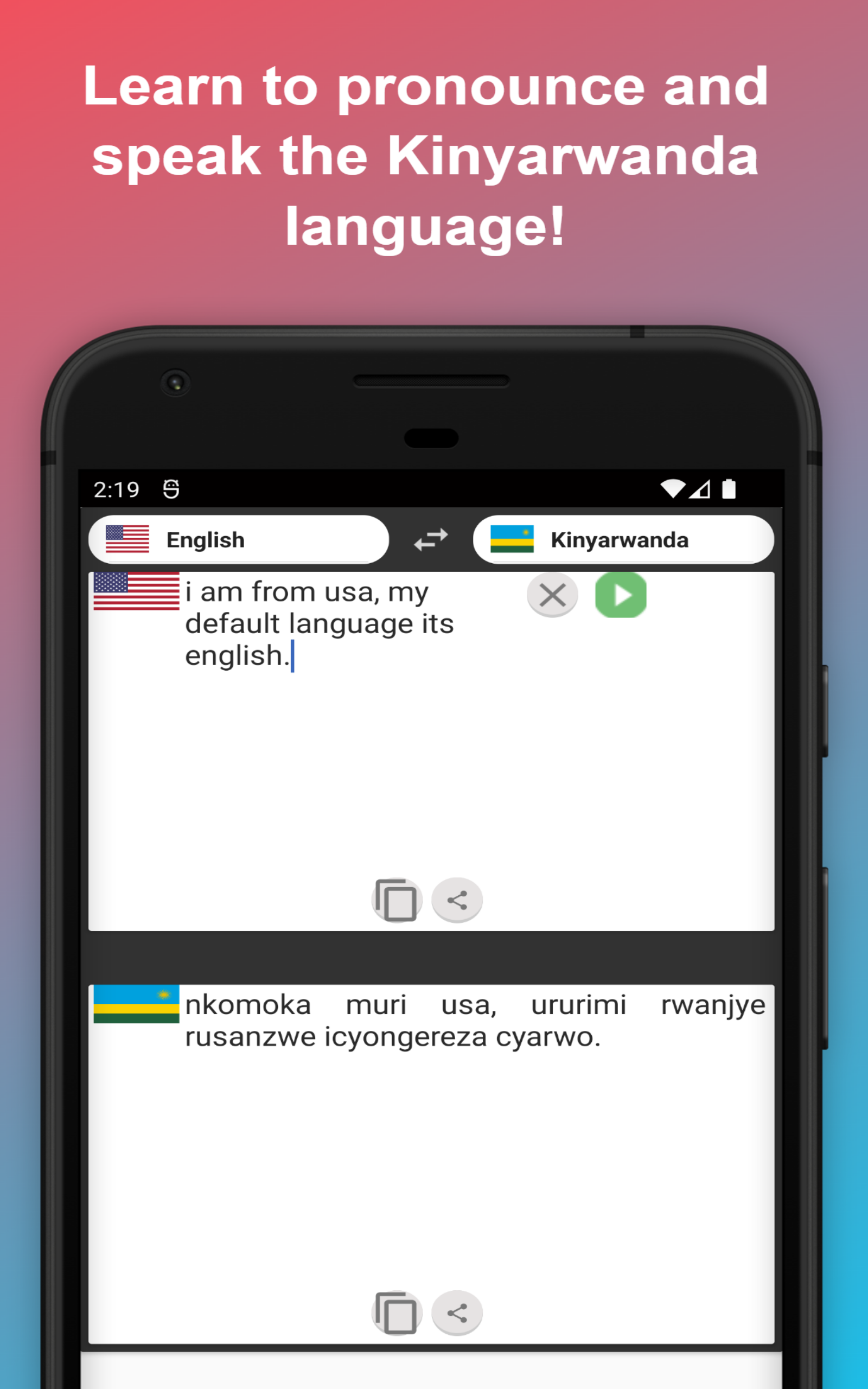 English to Kinyarwanda Translator to Translate to for Free on Telephone and Tablet App on You can translate text, words & phrases to more than 100 different languages! In the English - Kinyarwanda dictionary you will find phrases with translations, examples, pronunciation and pictures Benefit from instant results and translate up to 1000 characters per request